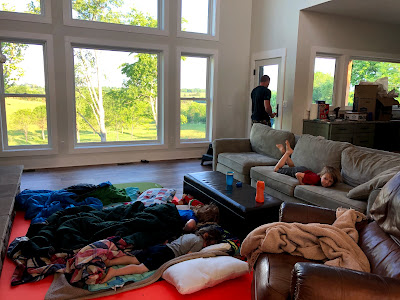 FINALLY!!! The day has finally arrived that we are moving in! The house isn't finished yet by any means but it is mostly livable. David Spencer so graciously convinced the inspector to let us move in despite the house being finished because I had already scheduled two weeks off to move. Moving like always was so much worse than we could have imagined. We filled up so many box trucks, it was ridiculous. Dave and Peggy really took on most of the hard work, and I watched the boys because my back pain didn't allow me to be of much help. Moving was such a headache that it often overshadowed our joy of moving into our dream home but once it was all finished we were so happy and tired. The boys are stuck sleeping on the living room floor for a week or two until the upstairs railings are installed but they don't seem to mind. We are looking forward to organizing, and putting our house together piece by piece.